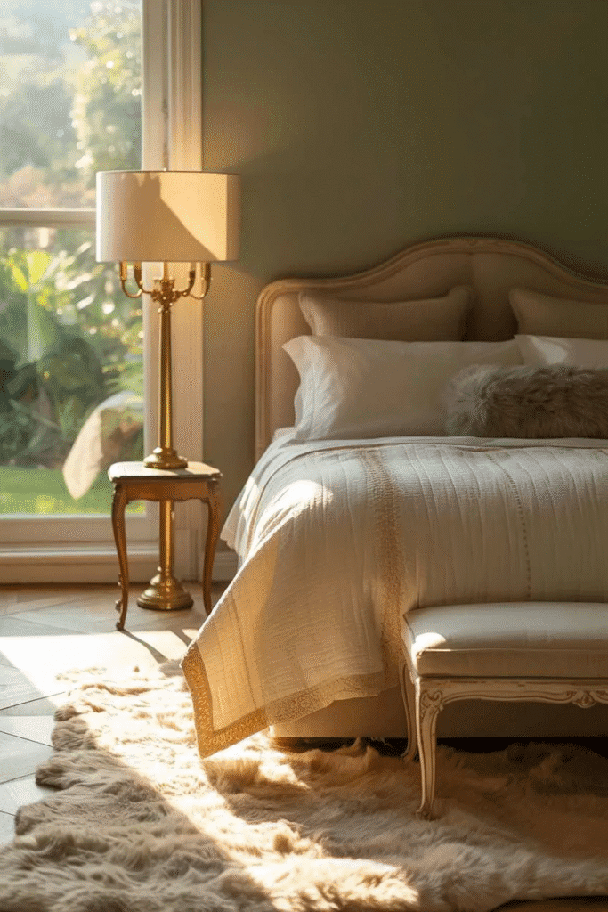 This calming color palette demonstrates how grown woman bedroom ideas can incorporate nature-inspired hues that promote relaxation.The sage green walls create a sophisticated backdrop that works beautifully with natural textures and warm metals.I love how this approach moves away from stark white bedrooms toward something more grounding and peaceful.The brass accents add warmth without feeling too trendy, while the connection to the garden outside brings life into the space.