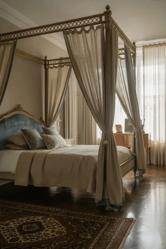 The drama of a four-poster bed paired with that stunning sapphire headboard creates instant sophistication.This represents exactly what grown woman bedroom ideas should encompass—pieces with presence and personality.The deep blue adds richness that feels both timeless and current.I appreciate how the neutral linens balance the bold headboard, creating a look that’s striking but not overwhelming.