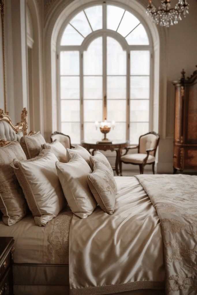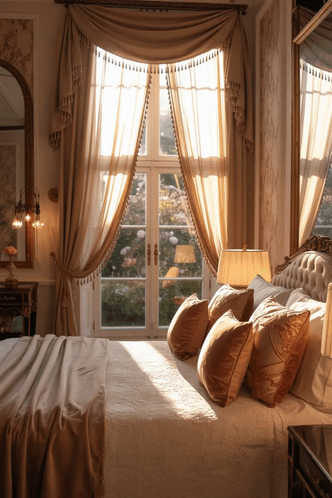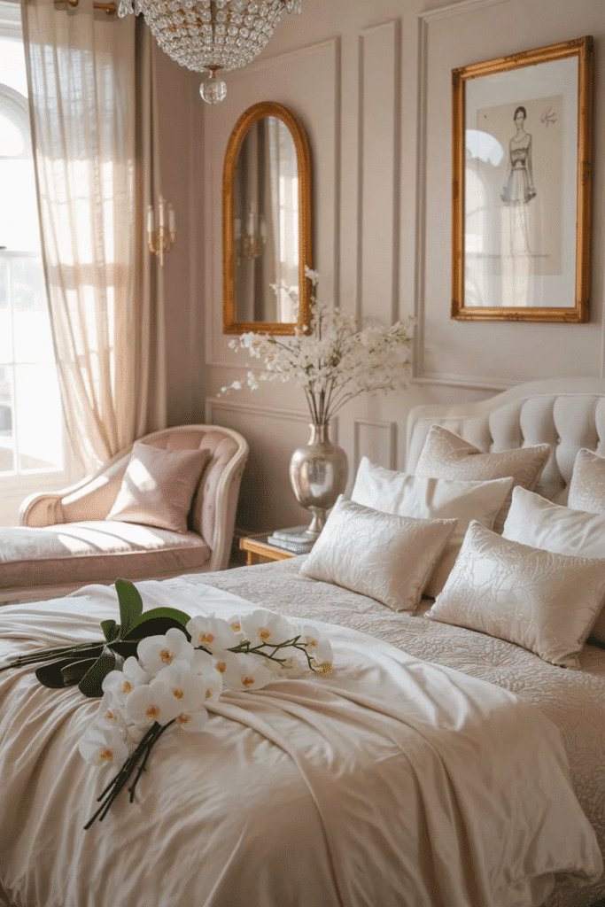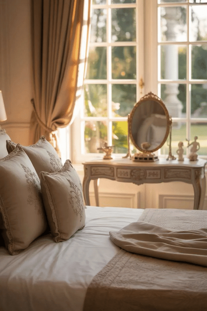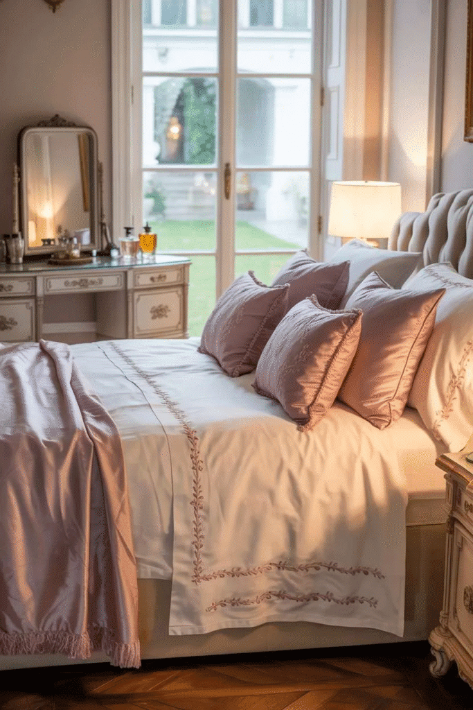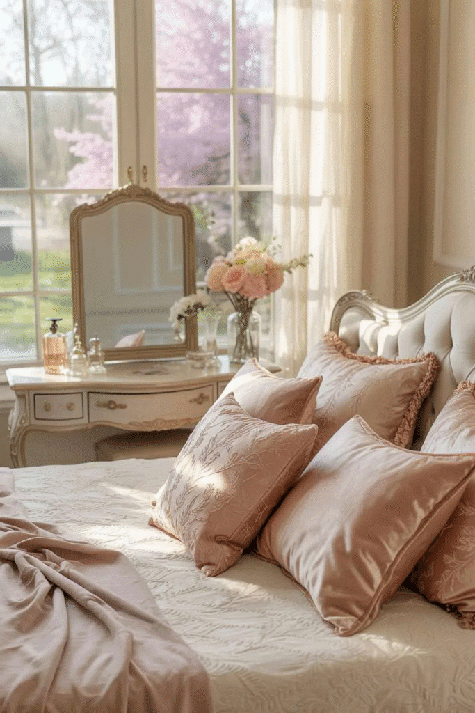 The soft pink throw pillows paired with ivory silk create such an elegant color story.This approach to grown woman bedroom ideas shows how pink can be sophisticated when used thoughtfully.The gold-framed mirror adds warmth and glamour, while the garden view provides a beautiful natural backdrop that changes with the seasons.