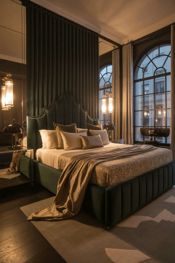The emerald green velvet headboard makes such a statement while maintaining sophistication.This approach to grown woman bedroom ideas shows how you can embrace bold colors in a refined way.The mirrored furniture reflects light beautifully, and that cityscape view adds urban sophistication.What I find most appealing is how the gold accents tie everything together without feeling excessive.