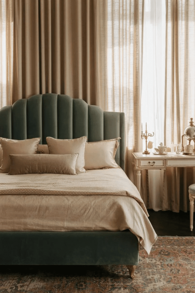 The dark teal headboard creates such depth and richness in this space.This color choice demonstrates how adult women can move beyond safe neutrals to embrace colors that feel both sophisticated and personal.The Persian rug adds pattern and history to the space, showing how quality pieces can anchor a room.The vintage vanity with brass fixtures brings functionality without sacrificing style.