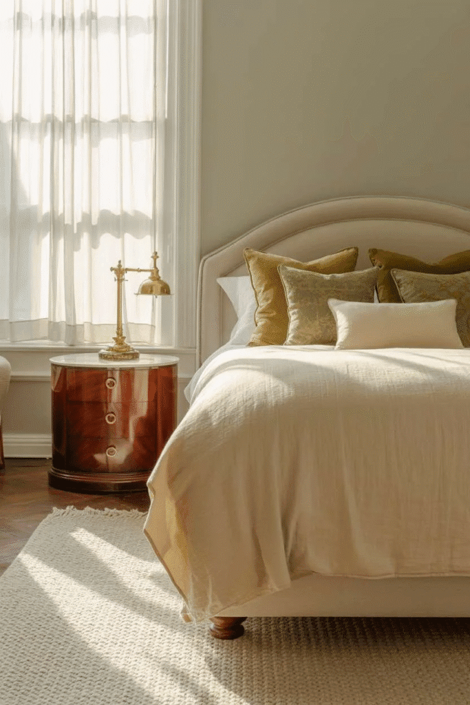 The geometric rug pattern adds visual interest without overwhelming the serene color palette.This exemplifies smart female room decor choices—incorporating pattern through textiles that can be easily updated.The mahogany nightstand brings warmth and richness that complements rather than competes with the other elements.I love how the muted gold and olive tones add just enough color to keep things interesting.