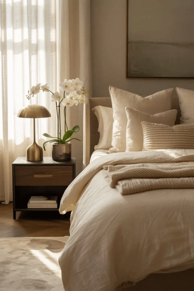 Sometimes, the most powerful grown woman bedroom ideas are the simplest ones.The single white orchid creates such an elegant focal point, proving that you don’t need lots of accessories to make an impact.The brushed brass lamp adds warmth to the neutral palette, and the abstract art brings personality without overwhelming the peaceful atmosphere.