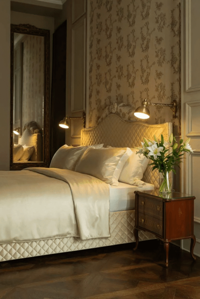 Bold wallpaper makes such a statement in this space, demonstrating how grown woman bedroom ideas can embrace pattern confidently.The brass reading lamps are both practical and beautiful, providing focused light for bedtime reading.The white lilies add fresh life to the room, and I love how the ornate mirror creates depth and reflects the beautiful details throughout the space.
