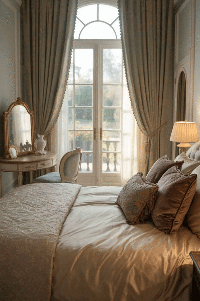 The large antique mirror strategically placed to reflect the garden view is such a smart design choice.This doubles the natural beauty and light in the space, showing how thoughtful adult women approach bedroom design.The rose and gold velvet pillows add luxury without excess, and the ornate wallpaper creates depth and visual interest on the walls.