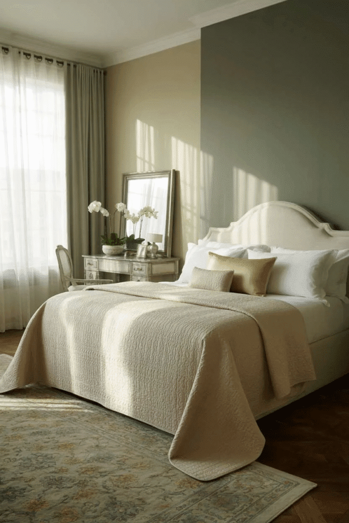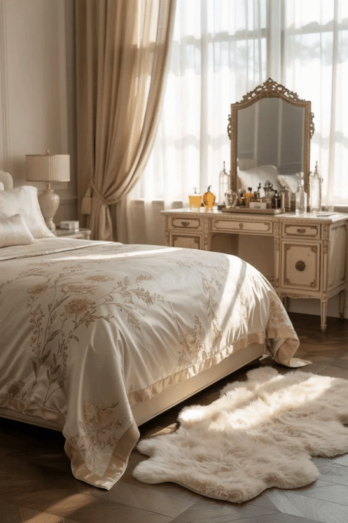 The champagne gold pillows add such richness to the ivory bedding, creating depth without overwhelming the peaceful palette.This represents a mature adult woman design that understands how metallic accents can elevate a space.The vintage vanity with its collection of perfume bottles tells a personal story, making this bedroom feel lived-in and loved.