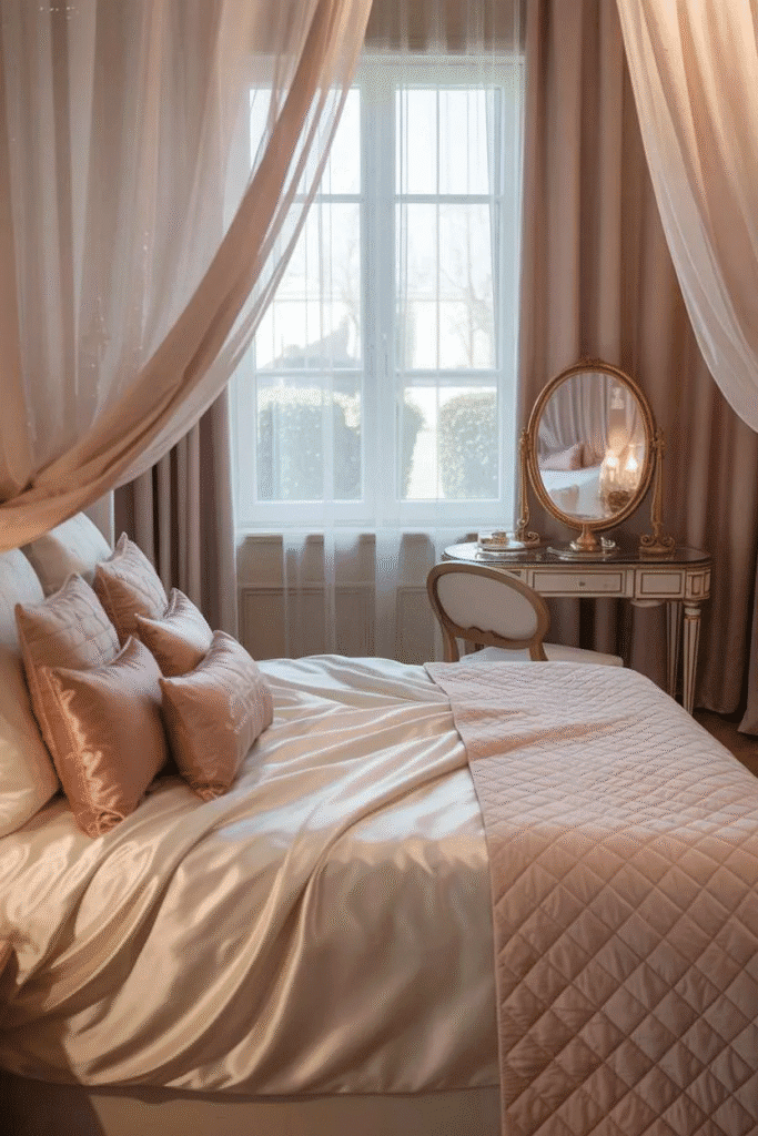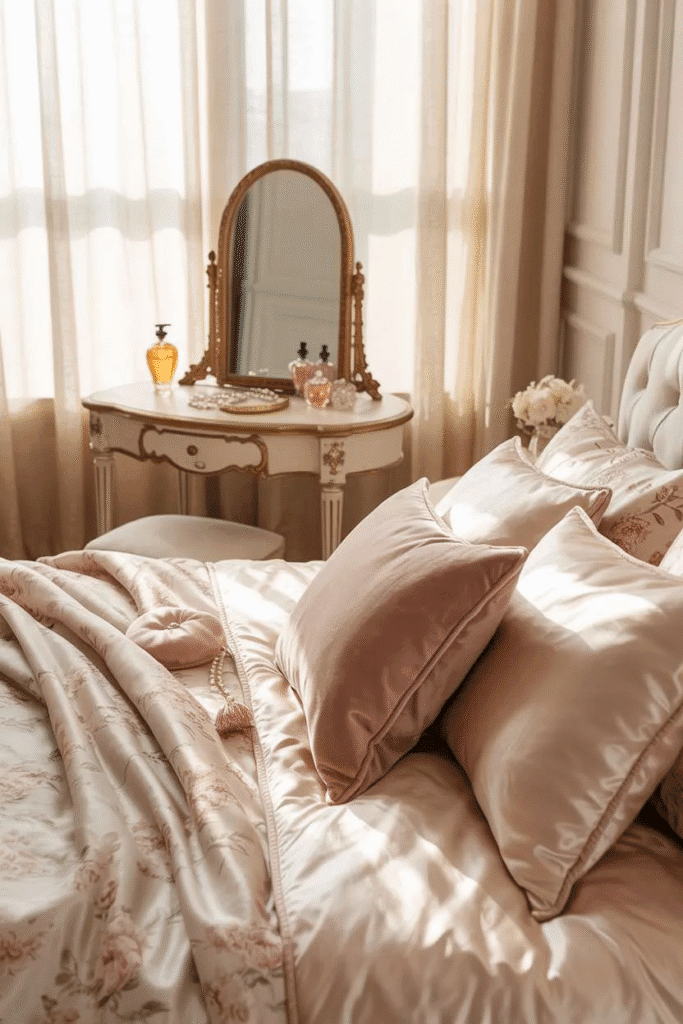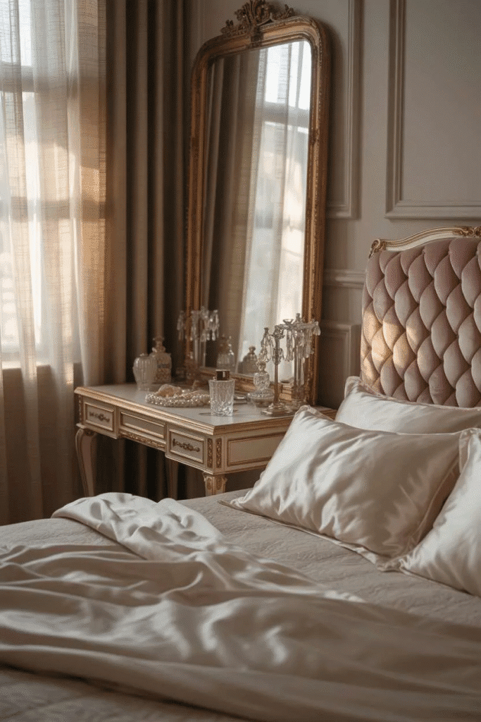 The soft blush and gold color scheme creates romance without feeling juvenile.This represents mature female room decor that embraces femininity in a sophisticated way.The ornate mirror adds glamour and reflects light beautifully throughout the space.What I appreciate most is how the vintage-inspired vanity provides both function and visual interest.