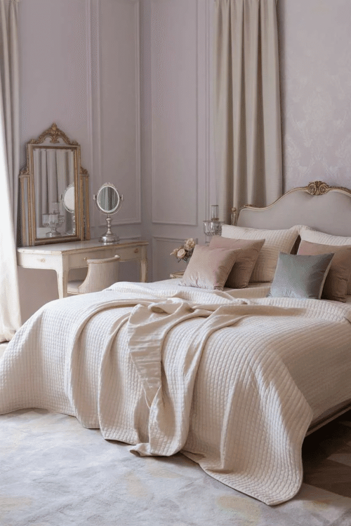 The embroidered detailing on the bedding adds such beautiful texture and craftsmanship to this space.This represents an adult woman’s bedroom design that appreciates quality and detail work.The lavender walls with crown molding create architectural interest, while the vintage vanity provides both beauty and functionality for daily routines.