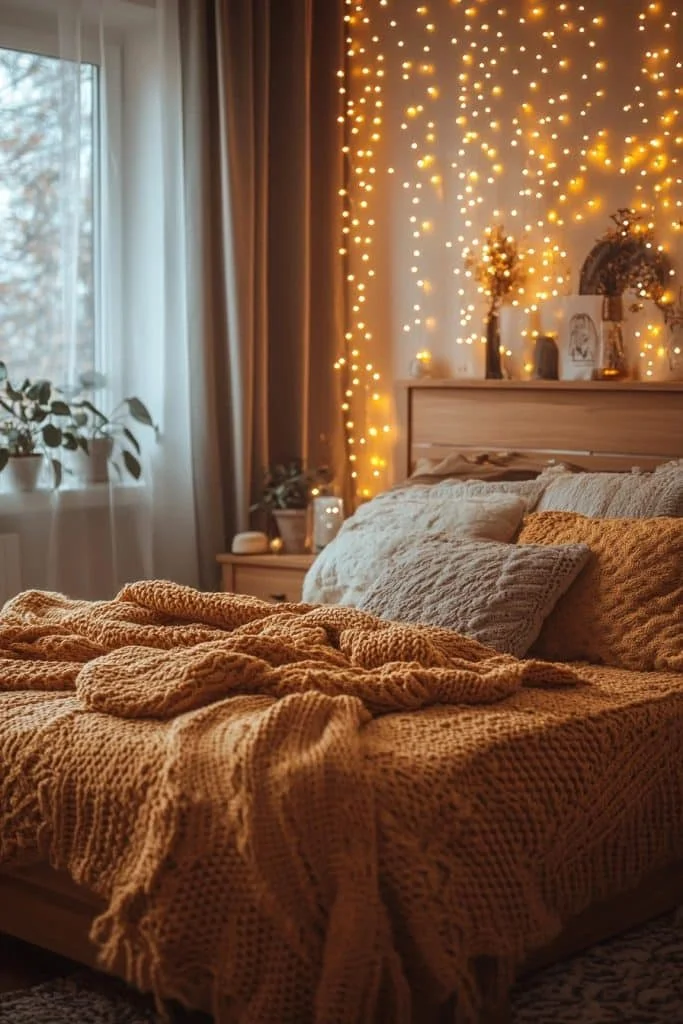 The Warm Amber Boho Haven uses amber-colored fairy lights to create a warm and inviting atmosphere, enhanced by earth-toned decor and soft textiles. This boho fairy lights bedroom idea is ideal for those who appreciate a cozy, nurturing environment. The amber lights emit a soft, warm glow that makes the room feel safe and welcoming, perfect for chilly evenings. It’s a snug retreat that exudes warmth and comfort.
