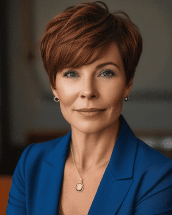 This sleek auburn pixie is perfect for a sophisticated look. The rich auburn colour complements warm skin tones beautifully, while the side-swept bangs add a touch of elegance. Ideal for oval and heart-shaped faces, this haircut is both professional and chic, making it perfect for any occasion.