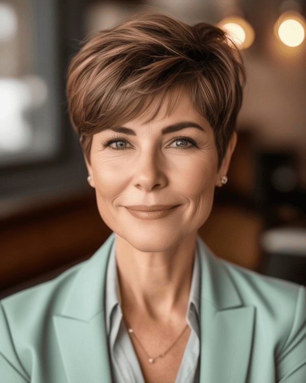 Check out this elegant layered pixie, perfect for those with a round or oval face. The warm brunette tones with subtle highlights add depth and dimension, making this style effortlessly chic. It’s a sophisticated yet easy-to-manage cut, ideal for showcasing a graceful and polished look.