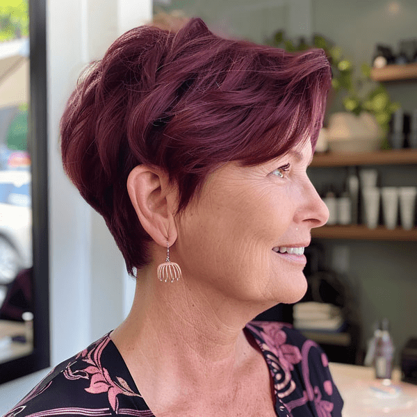 This rich burgundy pixie cut is perfect for adding a splash of colour and sophistication. The layered cut gives it a voluminous, youthful appearance, ideal for square and heart-shaped faces. It’s a bold yet classy choice that’s sure to turn heads. Perfect for showing off those fabulous earrings and adding a pop of personality to your style.