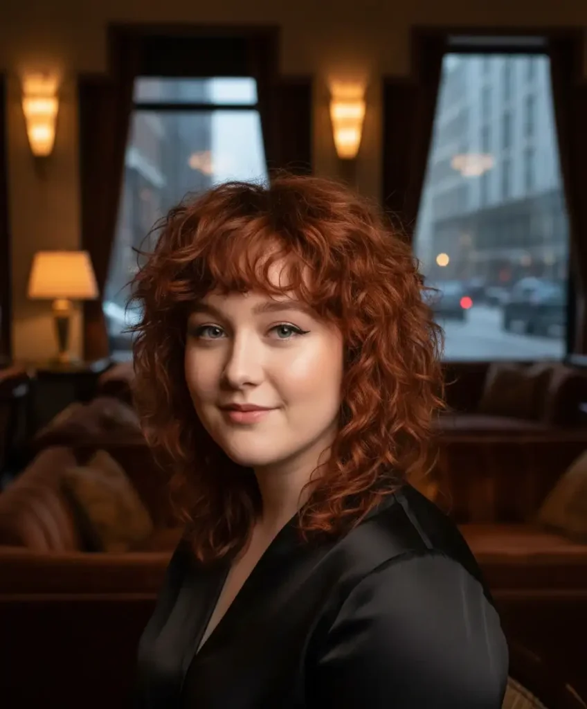 A midi shag with bangs is a versatile haircut that can be styled in different ways to fit any occasion. The curly shaggy layers add movement and texture, while the length makes it suitable for a professional setting. It’s a perfect combination of edginess and sophistication.