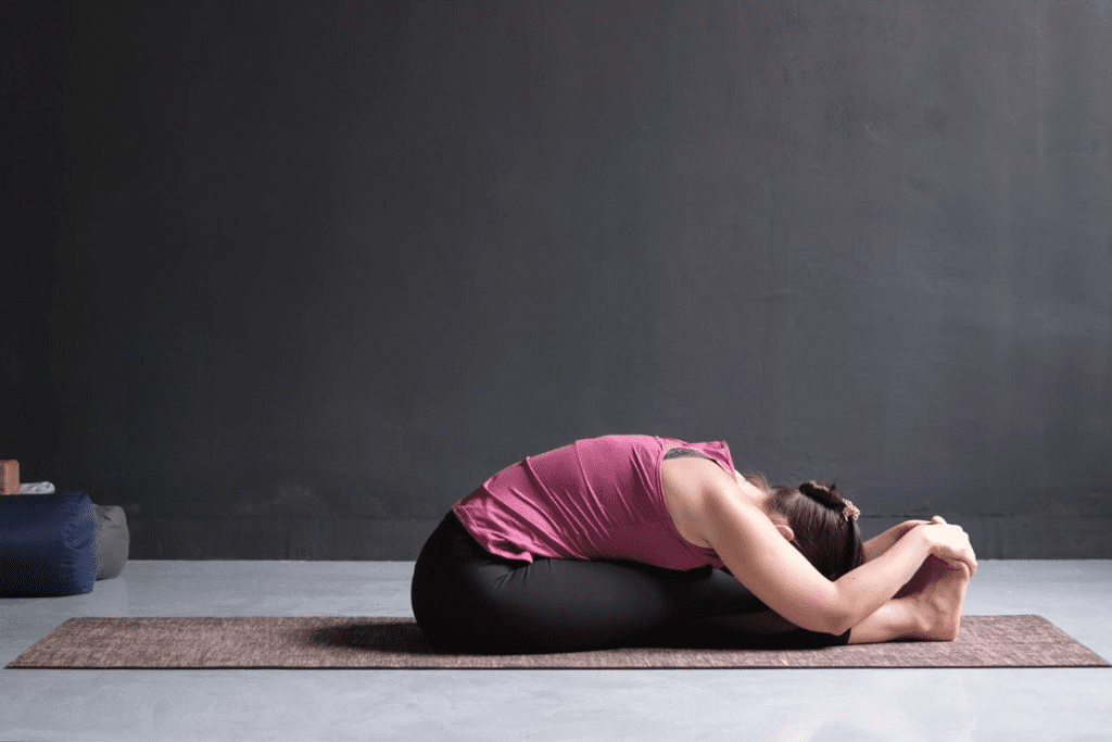 The seated forward bend is a calming way to stretch your hamstrings and lower back! Sit on the floor with your legs extended in front of you. Inhale, raising your arms overhead, and exhale as you bend forward from the hips, reaching for your feet.