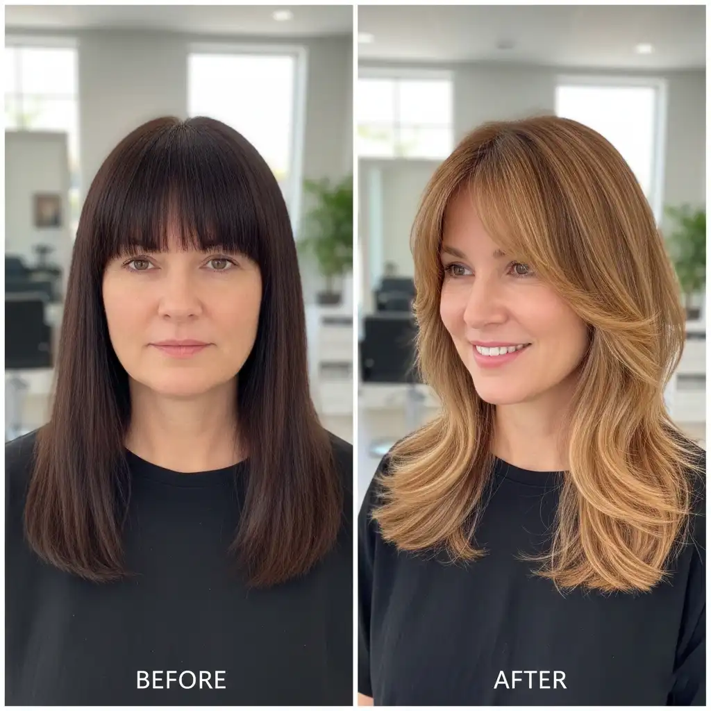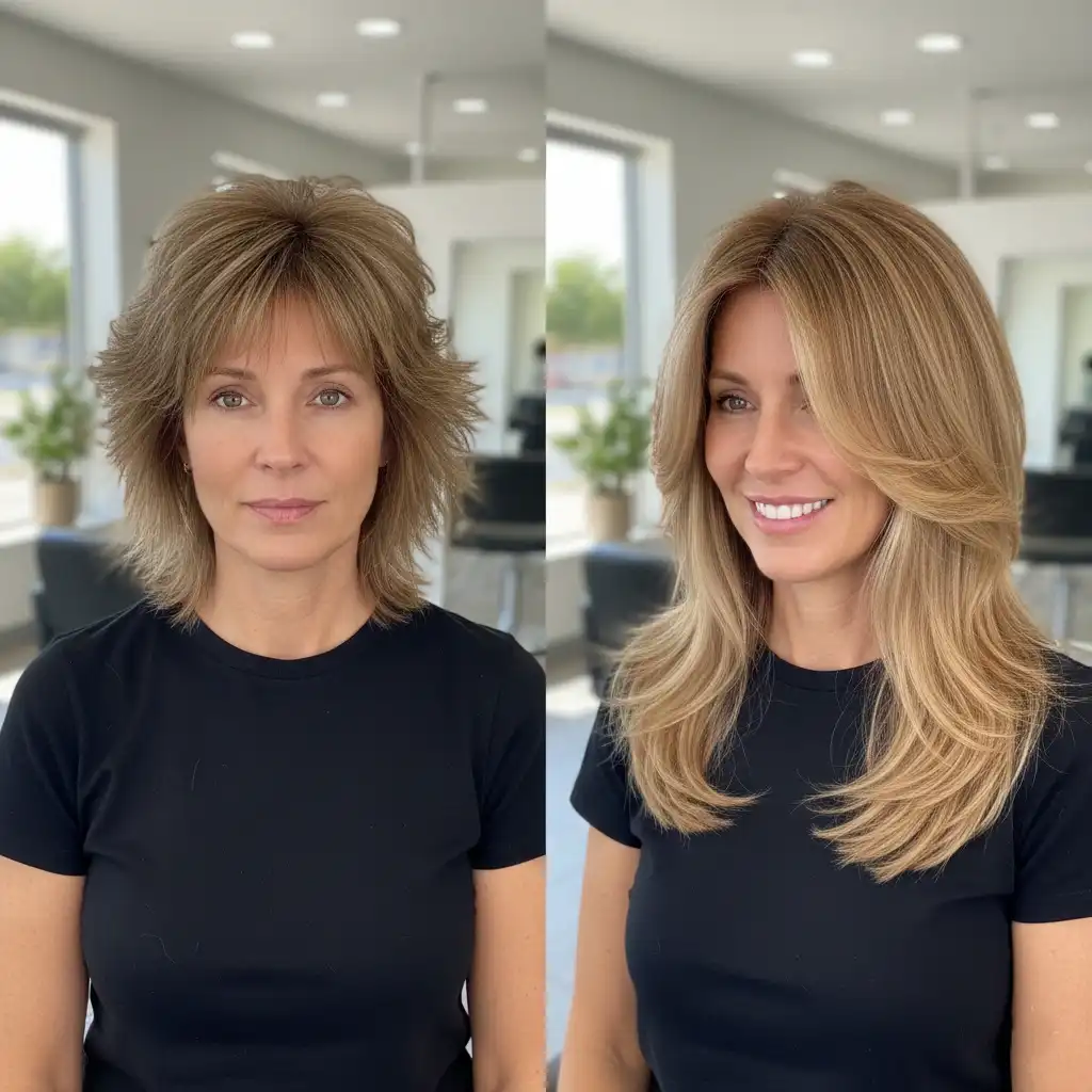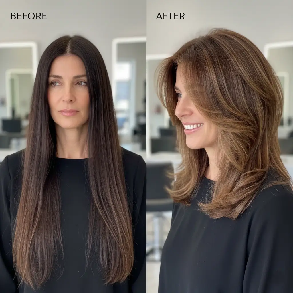 Face-framing layers soften features and add movement.