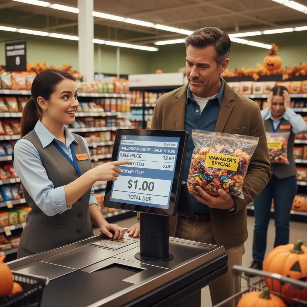 I noticed that one of the self-checkouts had a customer who was seemingly perplexed about something with the large bag of Halloween candy that he had just scanned, so I walked over to see what he needed help with. The moment I looked at the screen, I realized something was very wrong: he had scanned two items, one of which was $3.99 (not the candy), and the total price before tax was… $1.00?