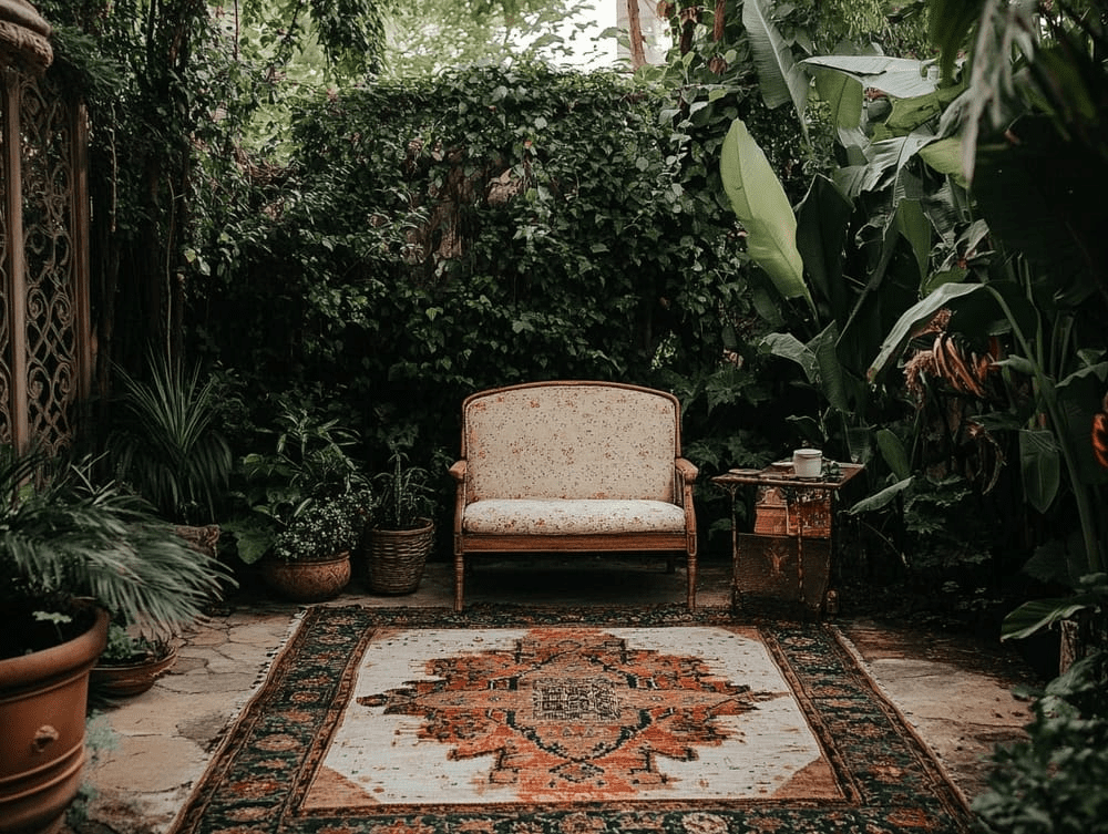 Place vintage rugs or tapestries in lounging areas or on patios for a cozy, inviting feel. The textures and patterns of woven rugs add warmth and create a designated relaxation space where you can meditate, read, or simply unwind. These rugs anchor seating areas and bring warmth and personality to the garden.The Sunnydaze Parisian Paradise Rug will make for a great vintage looking rug.