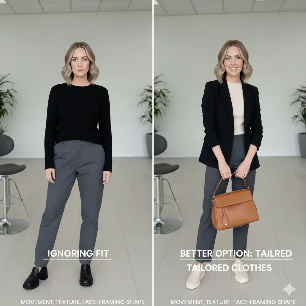 Boxy blazers, shapeless dresses, or low-rise pants from older fashion eras can age the body instantly.