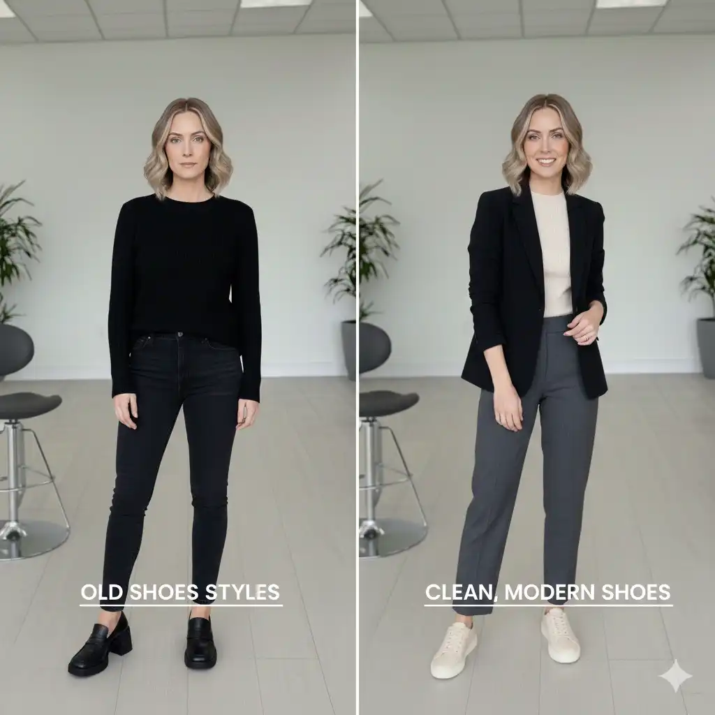 Chunky heels, overly square toes, or dated sneaker styles can instantly age even a nice outfit.