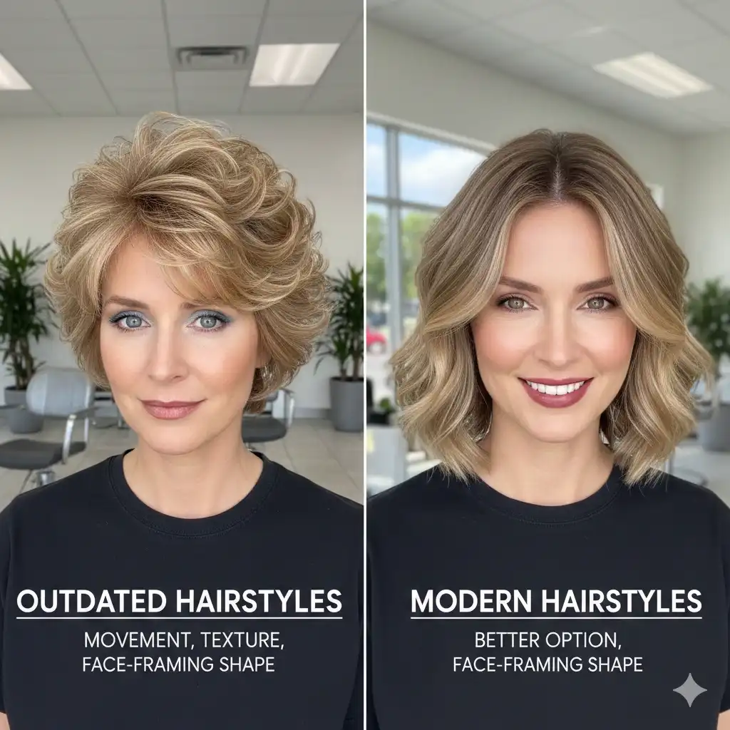 Styles that were trendy 10–20 years ago (overly layered cuts, stiff helmet-like shapes, or extreme teasing) can instantly date your look. They don’t match today’s softer, more natural beauty standards.