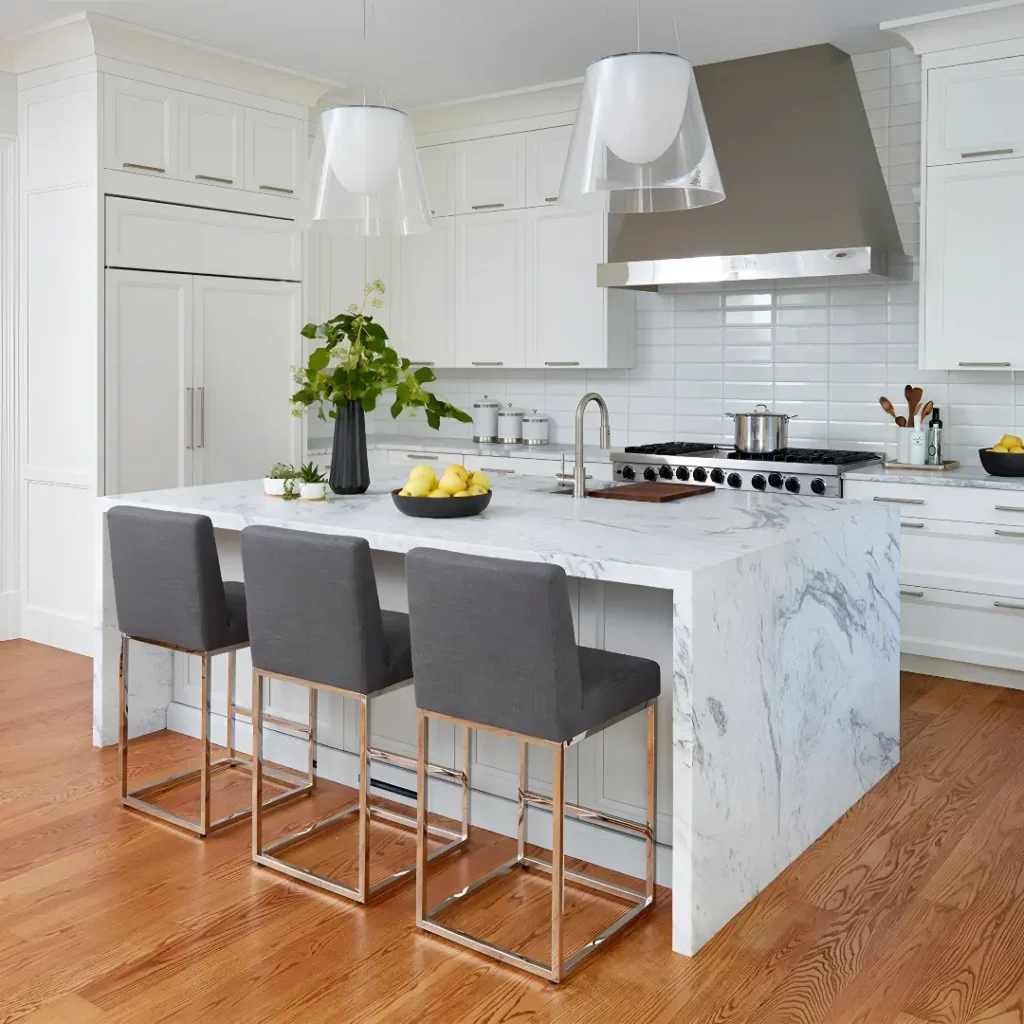 Want an island than feels more like a table? Have the counter hang over the base of the island and add legs to the corners for a table-style look. The island in this kitchen by designer Michelle Murphy of DEMI RYAN features Silestone Calacatta gold and a black base for a contrasting look.