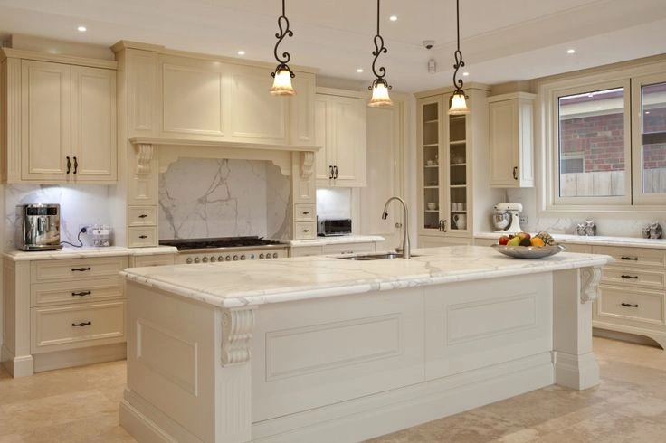 Can’t decide between a dining table and an island? You don’t have to with this style that melds the two. Designer Nicole Hirsch selected quartzite in a polished finish for the higher part of the island in this kitchen. “We wanted to create a point of difference in the material on the dining table part that cantilevers off the island, so we used a very clean piece of white quartz,” she says. “The pedestal on the dining table portion is a custom millwork cylinder we painted in a bright white to match the table top.”