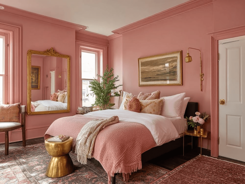 Pink and gold is a timeless combo. Incorporate brass hardware, gold-framed mirrors, or metallic lamps to add a touch of glam to your pink palette.