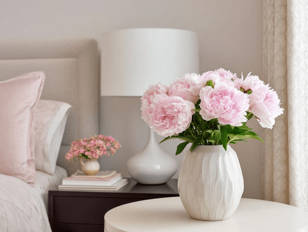 Fresh or faux pink blooms — peonies, roses, or cherry blossoms — bring instant joy and softness. Display them in a white or glass vase for an effortless touch.