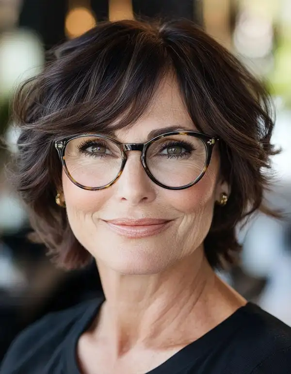 This elegant tousled bob is perfect for women over 60 with glasses. The soft waves and side-swept bangs create a youthful, dynamic look. The dark brown shade adds depth and richness, complementing the stylish frames. It’s a sophisticated and modern cut that enhances your natural beauty effortlessly.