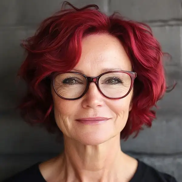 Embrace your bold side with these stunning red waves. This vibrant, short haircut perfectly complements your glasses, adding a touch of drama and fun. The rich red shade gives you a youthful and edgy look, while the soft, tousled waves add volume and movement. Perfect for making a statement!