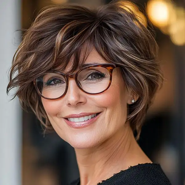 This textured pixie cut offers a chic and modern vibe for women over 60. The multi-tonal brown hues add depth, while the tousled layers provide a playful, voluminous look. Paired with trendy glasses, this haircut is perfect for anyone looking to showcase their spirited personality with ease.