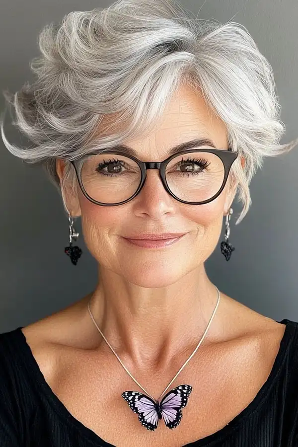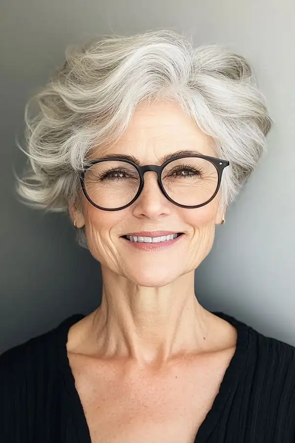 This elegant silver pixie cut is both stylish and sophisticated. The soft waves add volume and movement, making it a flattering choice for women over 60. Paired with chic black-framed glasses, this look is perfect for adding a modern touch to your appearance while embracing your natural gray hair.