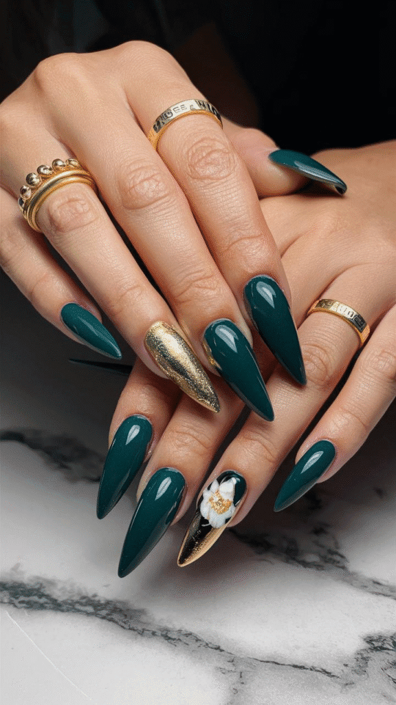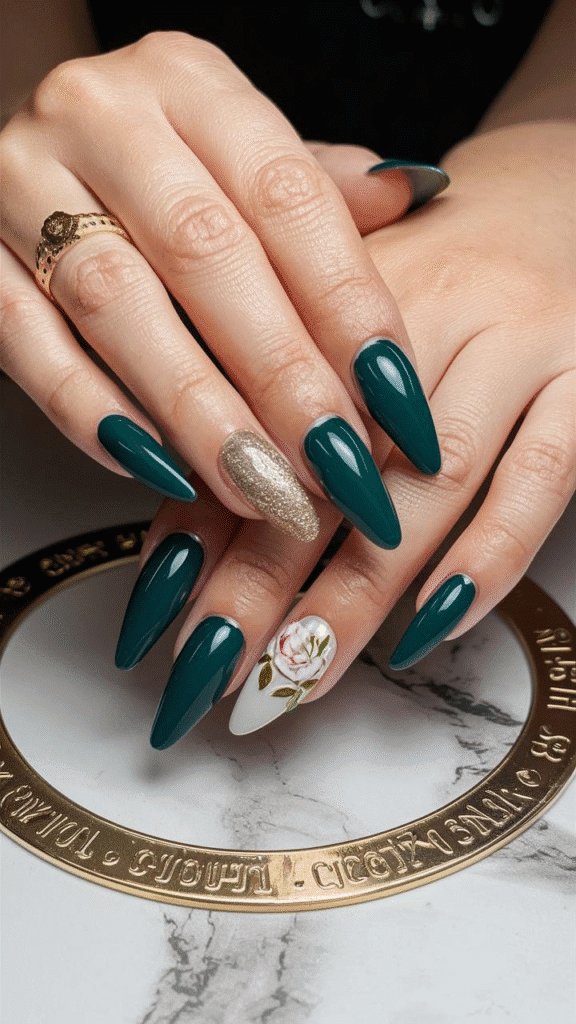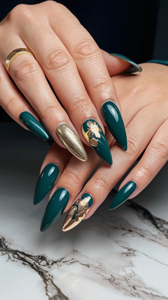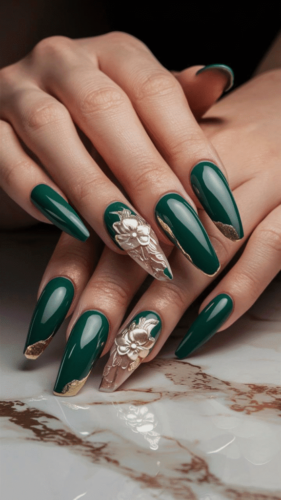 5. Chic Emerald Gel Nails with Metallic and Floral Details for 2025