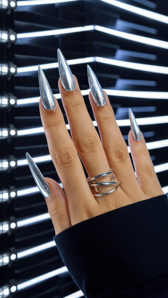 This striking image showcases an eye-catching set of gel nails that perfectly captures the futuristic metallic trend expected to dominate in 2025. The sharp, elongated design reflects light in a dazzling array of silver tones, creating a bold statement suitable for fashion-forward individuals who love to stand out. Ideal for those attending parties, fashion events, or simply wanting to elevate their everyday look, these nails demand attention and creativity. For anyone looking to replicate this style, it’s advisable to consult with a skilled nail artist familiar with advanced techniques to ensure a flawless finish that combines both artistry and durability.