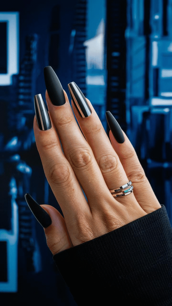 This image showcases a striking set of gel nails featuring a combination of matte black and metallic finishes, exemplifying the innovative nail art trends expected to dominate in 2025. The elongated shape enhances the dramatic contrast between the matte and glossy elements, creating a sophisticated yet edgy look. This style is perfect for individuals who enjoy expressing their personality through bold fashion choices, making it ideal for both everyday wear and special occasions. To achieve this look, it’s essential to work with a skilled nail artist who can expertly blend these finishes, ensuring a clean and polished appearance that stands out beautifully.