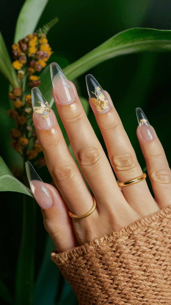 This stunning image features a set of gel nails that elegantly blend nature-inspired elements with modern design, highlighting a prominent trend for 2025. The clear tips, embellished with delicate gold accents and subtle floral motifs, create a refined and sophisticated look that resonates with the beauty of the natural world. This style is ideal for individuals who appreciate artistic expression and wish to showcase their unique personality through their nails. To achieve this exquisite design, it’s essential to collaborate with a skilled nail artist who can bring your vision to life, ensuring that your manicure not only looks beautiful but also complements your overall aesthetic.