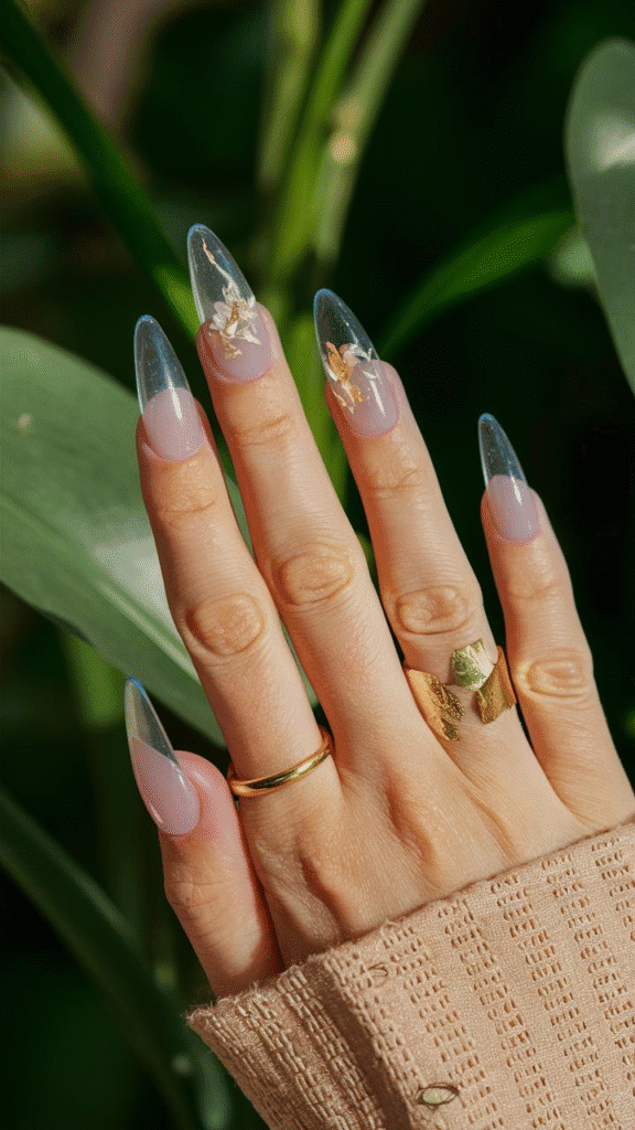 This captivating image showcases a stylish set of gel nails that embody the harmony between elegance and nature, a key trend for 2025. The nails feature a unique combination of clear tips and soft pink bases, adorned with delicate floral accents and shimmering gold details, creating a fresh and sophisticated aesthetic. This design is perfect for those who wish to express their individuality and love for nature through their manicures. For the best results, consider visiting a professional nail technician who can ensure meticulous application and detail, allowing your nails to be a stunning reflection of your personal style.