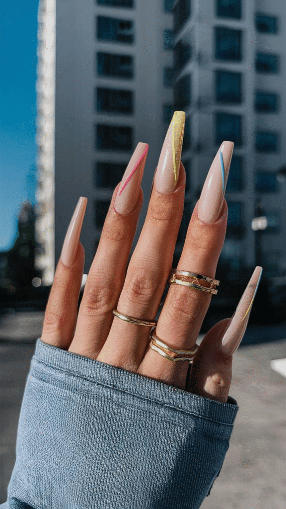 This striking image illustrates a fashionable set of gel nails that perfectly encapsulates the geometric design trend anticipated for 2025. Featuring a neutral base with sharp, angular tips, the nails are enhanced by vibrant neon lines in pink and yellow, creating a bold and contemporary look. This style is ideal for trendsetters who want to make a statement while maintaining a polished appearance. For those interested in this design, seeking a skilled nail artist who specializes in geometric patterns can ensure precision and creativity, resulting in a stunning manicure that reflects modern aesthetics.