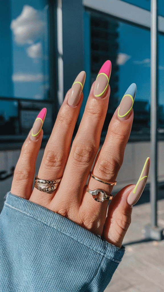 This vibrant image showcases an eye-catching set of gel nails that exemplify the bold color trends expected for 2025. With a soft nude base, the nails feature striking geometric lines in neon pink and yellow, creating a playful yet sophisticated look. This style is perfect for fashion-forward individuals who enjoy experimenting with their nail art and want to stand out. For those considering this design, it’s advisable to choose a nail technician experienced in intricate patterns to achieve a flawless finish that truly captures the essence of modern nail art trends.