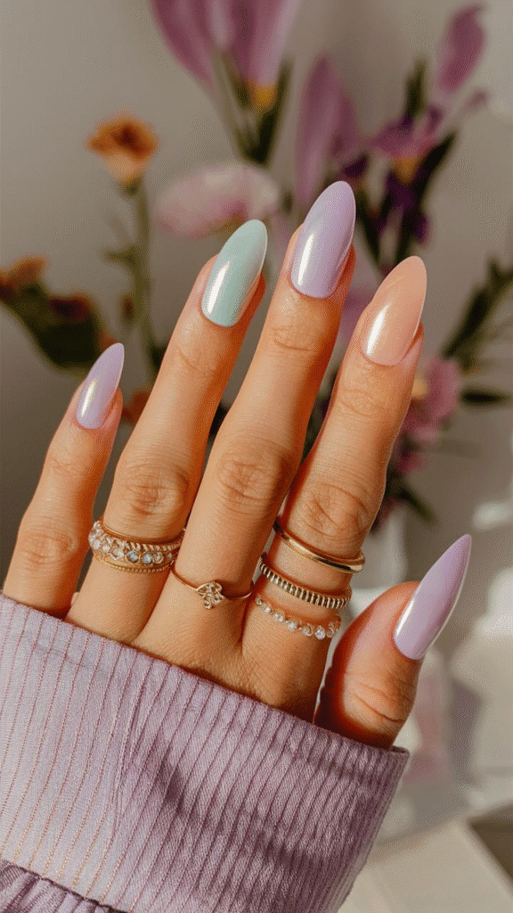 This vibrant image showcases a stunning array of gel nails designed with a captivating multi-colored palette, perfectly aligning with the bold trends expected in 2025. Featuring a blend of soft lavender, mint green, and peach shades, each nail exhibits a glossy finish that adds depth and shine. This playful yet sophisticated design is ideal for fashion-forward individuals who enjoy experimenting with color while maintaining elegance. For those looking to achieve this look, it’s essential to visit a professional nail artist who can expertly blend these shades and create a seamless finish, ensuring your nails stand out in any setting.
