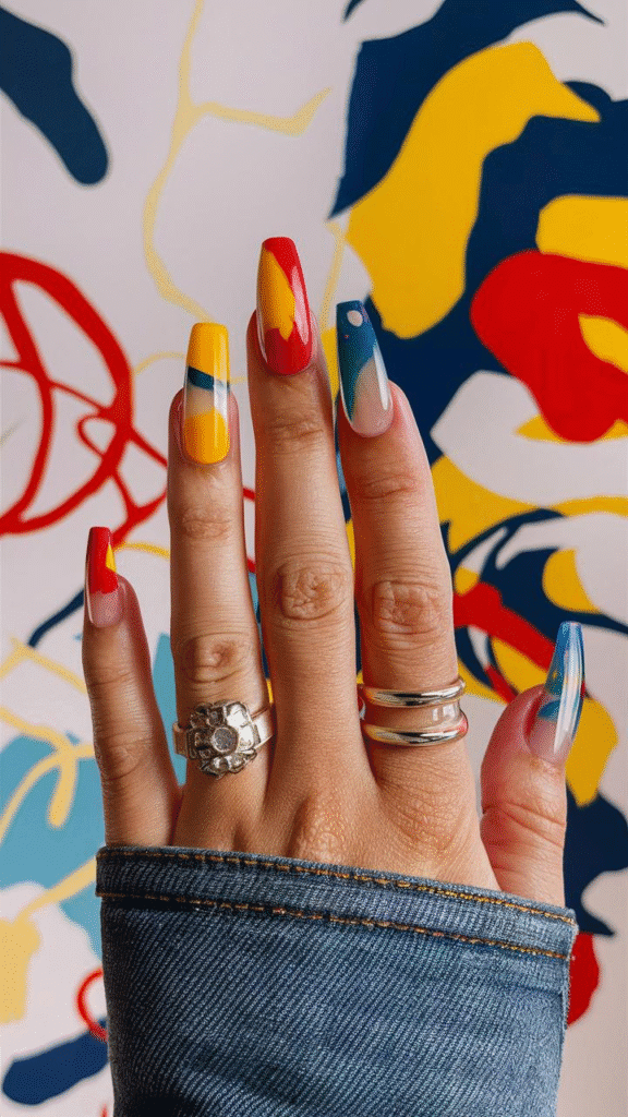 This vibrant image showcases a striking set of gel nails that embody the bold artistic trends expected in 2025. Featuring a stunning array of colors—bright yellows, reds, and blues—these nails are adorned with dynamic abstract patterns that make a powerful statement. This design is perfect for individuals who enjoy showcasing their creativity and personality through their nail art. To achieve this eye-catching look, it’s advisable to consult a professional nail artist skilled in abstract designs, ensuring that each brushstroke is expertly applied for a polished finish that truly stands out.
