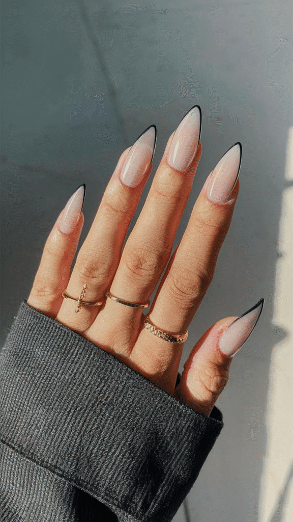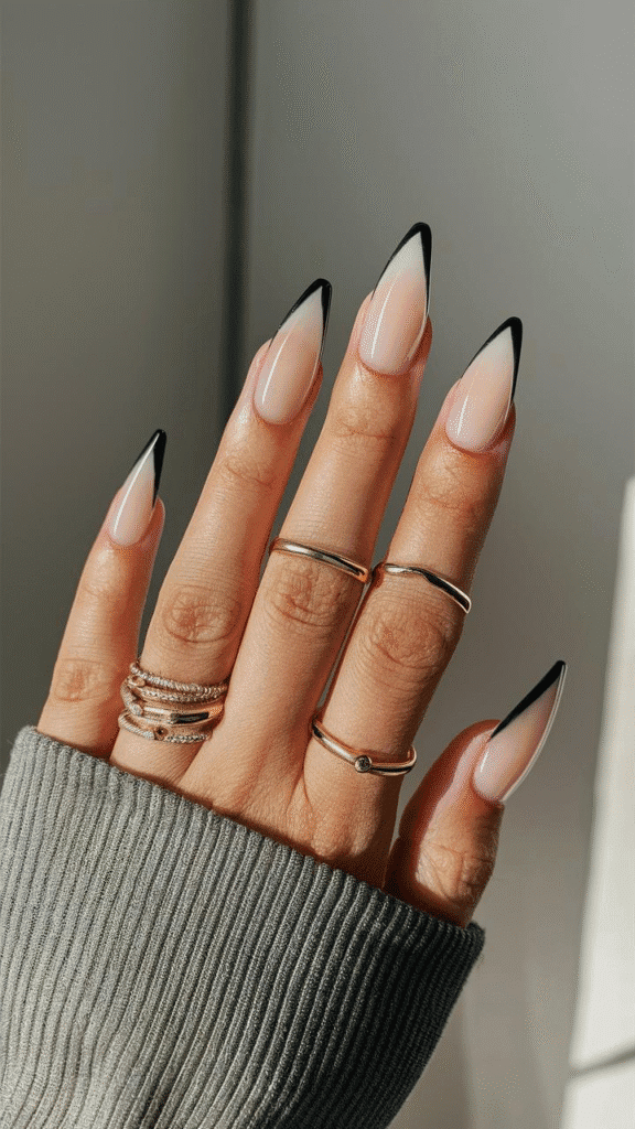 This captivating image showcases a pair of elegant stiletto gel nails that blend modern sophistication with edgy flair, embodying the nail trends anticipated for 2025. The nails feature a delicate nude base complemented by sharp black tips, creating a striking contrast that is both chic and daring. This style is ideal for trendsetters and fashion enthusiasts who want to make a bold statement. To achieve this look, it’s advisable to visit a skilled nail technician who can ensure precise application and design, as well as maintain the nails’ health and longevity, allowing for an eye-catching finish that stands out in any setting.